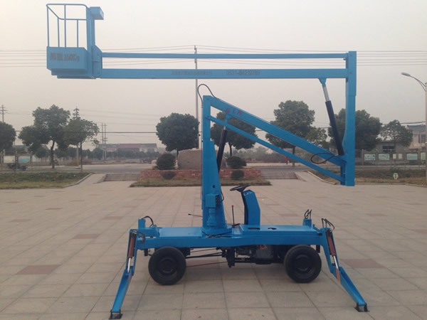 曲臂式升降平臺規格:外形尺寸:3900*2200*2900 (MM)臺面尺寸:700*600(MM)主結構:采用Q235鋼板(5 mm)對折焊接,旋轉360度。液壓支撐腿,驅動型式:自行式,啟動方式: 電啟動 發動機功率(HP): 12電源電壓(V):12 支腿型式: 液壓支撐 抗風能力: ≤5級